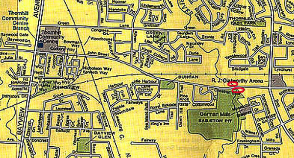 The Monument is on the south side of John Street. You can explore from the north and the south side down to the Don River. Back to German mills Site Back to Discovery Menu